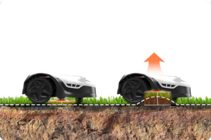 The new floating cut deck of the Sunseeker robot mower can automatically adapt the blade height to the natural unevenness of most lawns. This not only prevents the blade deck from scratching your lawn but also avoids collisions with fallen branches.